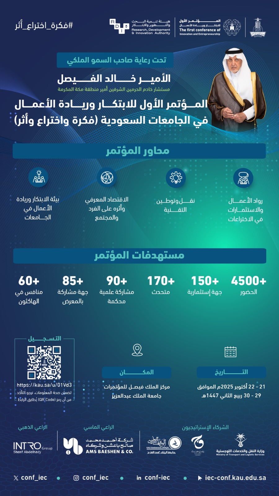 تنطلق أعمال المؤتمر الأول للابتكار وريادة الأعمال في الجامعات السعودية برعاية كريمة من صاحب السمو الملكي الأمير خالد الفيصل، مستشار خادم الحرمين الشريفين وأمير منطقة مكة المكرمة، ليجمع نخبة من المبدعين ورواد الأعمال والأكاديميين في منصة وطنية تحت شعار "السعودية: فكرة، اختراع، وأثر".